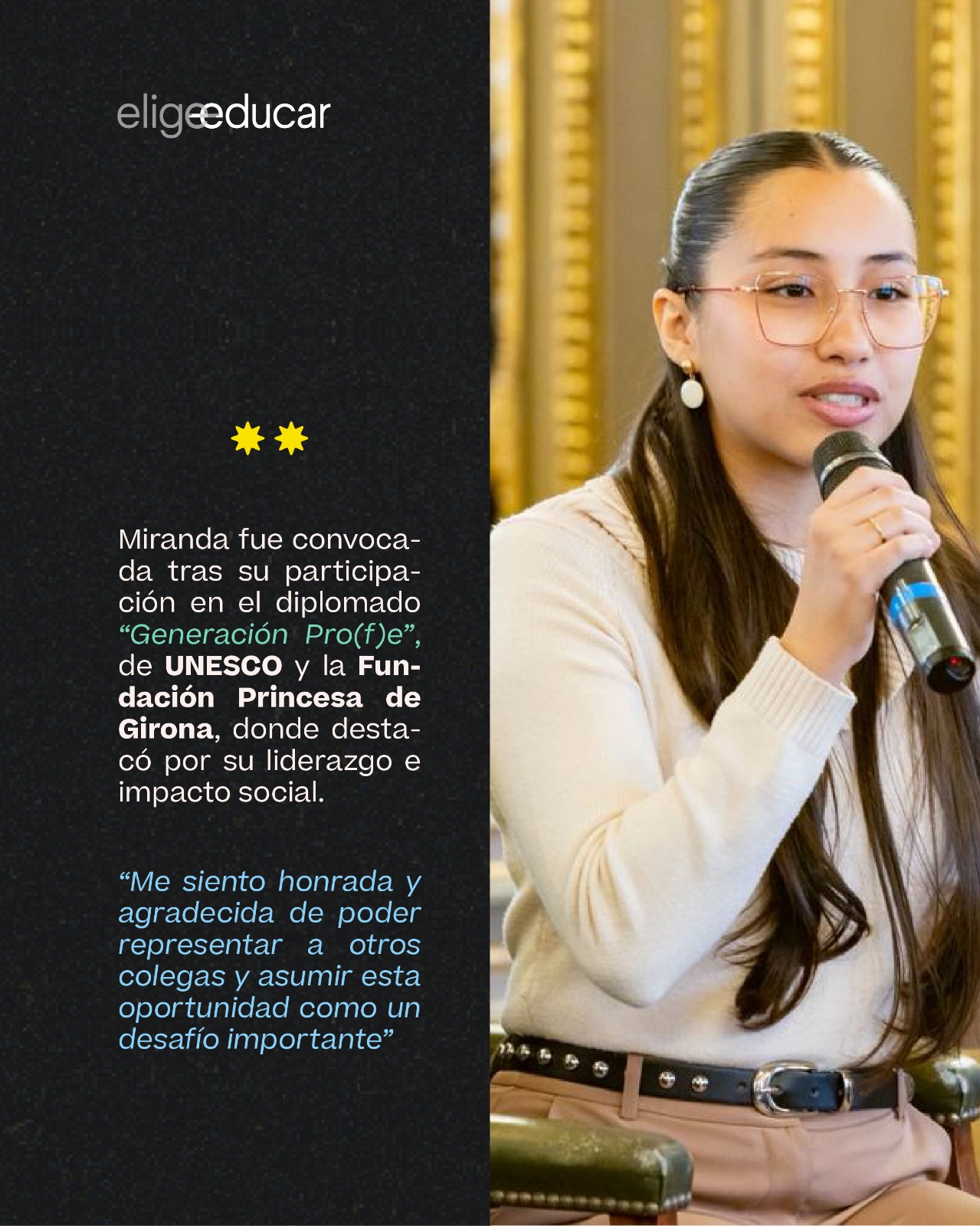 Desde Elige Educar destacamos esta instancia que refleja el liderazgo y compromiso de una nueva generación de docentes en Chile. La participación de Miranda Fernández también releva la importancia de visibilizar a docentes jóvenes que, desde el inicio de su trayectoria, están contribuyendo al fortalecimiento de la educación y al desarrollo de futuras generaciones de profesores.
