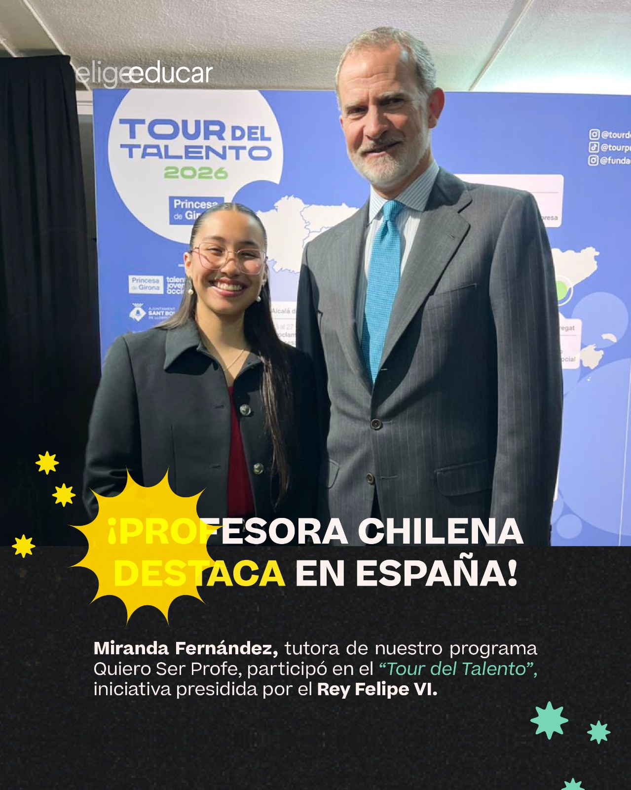 La profesora chilena de 22 años, Miranda Fernández, fue seleccionada entre jóvenes de toda Latinoamérica como representante del talento de la región para participar como líder educativa en dos de los paneles del “Tour del Talento”, una instancia promovida por la Fundación Princesa de Girona y presidida en su versión 2026 por el Rey Felipe VI de España. Esta gira anual recorre distintas ciudades de dicho país —como Sant Boi, Huesca, Alcalá de Henares, Granada y Murcia— e incluye diversas actividades presenciales y en formato digital para jóvenes entre 16 y 35 años que buscan descubrir su talento y ponerlo en acción.